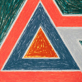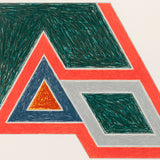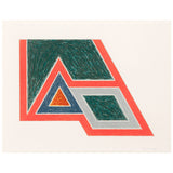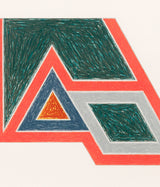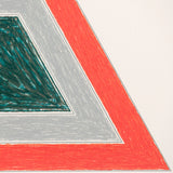 This series of prints were inspired by the "Polygon" paintings created during 1965-1967. Each form was created in four different color combinations. Aesthetically there is a subtle but significant difference between the canvases and the prints. Like many of Stella's multiples, there is a trompe d'ceil effect; the sections of color appear to have been sketched in with a crayon yet bound in with a sharp outline. The canvases, on the other hand, had dense flat colors.
