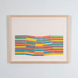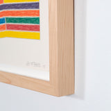 "Fūrg" was created in 1975 and perfectly demonstrates Frank Stella's enduring appeal - the hypnotic arrangement of vibrant contrasting colors and geometric shapes. The rows of colored strips hint at the shape of a rectangle, albeit with a dip in the center. The strips are alternative in color and length, seemingly at random. The multi-colored shape occupies only the bottom half of the print, leaving the top half empty.