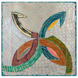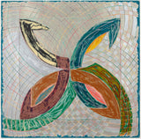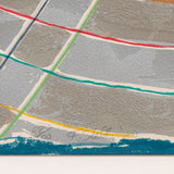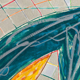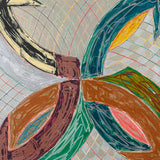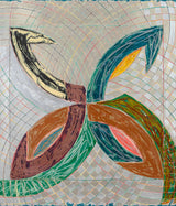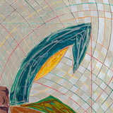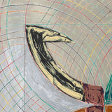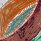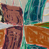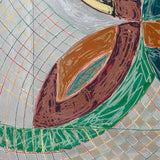 The Saskatchewan paintings contained flat-painted, bold color-blocking, while the works in this portfolio showcase colors mixed together and scribbled over one another with colorful, swirling grid backgrounds. This is the result of numerous layers of lithography and screen-printing and marks the first time for Stella that his prints become new works, free of their original source material, even in name.