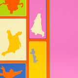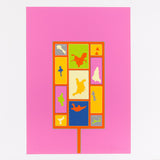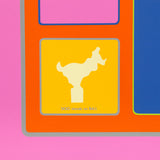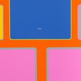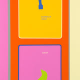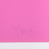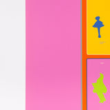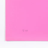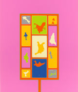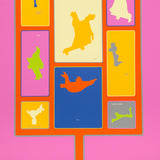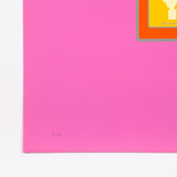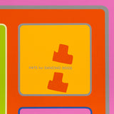 This work differed from the "Stretch" works in several ways. Besides the complexity of composition and the inclusion of text, these works were the result of an elaborate process. The silkscreens were made from hand-cut screens, one for each color. While the "Stretch" works were two colors, these works were upwards of seven. In "Child's Punchout" we see the bubble-gum pink, cinnabar,navy, grey, lime, peach and cream.