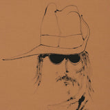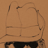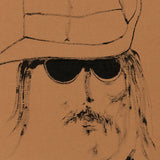 This artwork is an emblem of the psychedelic sixties and hippie seventies. The character is wearing a digger hat (also called “slouch hat”) that covers a part of his face and groovy hair. This symbolic hat was commonly worn as part of a military uniform in many western countries. Like many counter-culture characters he is overtly subverting the hierarchy with his rebellious look. Today, a man with long-hair is common, however in 1968 this was considered quite a renegade style.Â