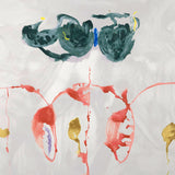 The artist frequently employs color in almost combative ways - juxtaposing hues that avoid being too harmonious or decorative. In "Aerie" while the contrasts between the main color characters are strong (a dense forest green is directly above a looping band of lobster red) the overall composition and palette is pleasing and compatible.