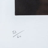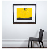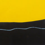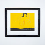 The artist was a prolific and experimental printmaker. She worked with lithography, etchings, woodcuts and screenprints.  “Plaza Real”, typical of her prints, is remarkably complex and labor intensive. The screenprint is a prime example of her aesthetic trademarks; a dynamic use of negative space, bold color choices and suggestive shapes. A field of yellow contains swirls of beige and speckles of color floating above a strip of black which grounds the composition and perhaps recalls a body of water.