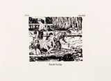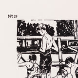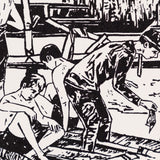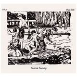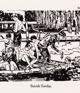 "Suicide Sunday" depicts a group of young men sitting atop a cardboard raft as they participate in a river race to commemorate the end of exam season. Half of the young men appear to be drying off in their swim trunks, while the others either steer the boat or assist a rogue teammate. A sense of leisure and camaraderie permeates the scene, highlighting their youth and lighthearted pleasure. Yet the title invites the viewer to search for something more menacing or sombre in the composition.