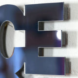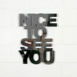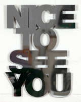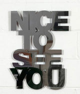 Text is integral part of Jade Rude's practice. Her sculpture "Nice To See You" blurs the responsibilities of mirror, signage and slogan.