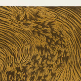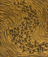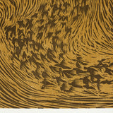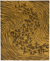 Nares' contribution is both exceptional and evocative of his practice that frequently depicts momentum rather than pattern or structure. Using woodcuts to create the relief print, Nares involves a swooping design comprised of intricate gestural strokes that convey movement, wind or flight. This work is an interesting anomaly in his oeuvre because of the figurative element. The image is comprised of dozens of starlings' silhouettes captured in a huge migration.