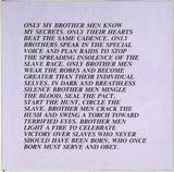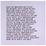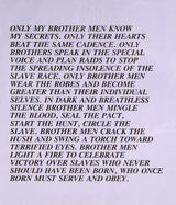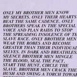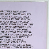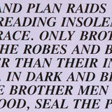 This lavender-hued Inflammatory Essay centres around a dark brotherhood bound in their rule over slaves. The brotherhood seal their bonds of solidarity through a pact, dress (robes), and a shared goal of maintaining power. They speak of slaves as sub-human beings born only to obey and serve, a position which the brotherhood reinforces through terror and violence. Though never named, this group of men shares common traits with contemporary and historical hate groups who came to and held power through espousing racist ideas and brutality. There is an uncomfortable contrast between the brutality of the text and the gentleness of the sheet's color.
