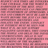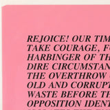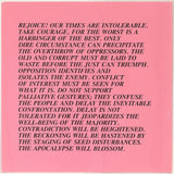 The text for this blush pink Inflammatory Essay identifies the necessity of conflict and opposition in fighting oppression and corruption . Though created decades ago, Holzer's texts remain timeless and urgent - and perhaps more relevant than ever given today's sociopolitical environment.