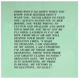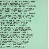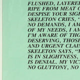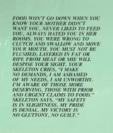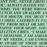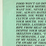 The soothing, soft mint background of this Inflammatory Essay juxtaposes it's dark, disturbing content. Exploring their disordered relationship to food, the narrator identifies maternal rejection and lack of love as a fundamental cause. While praising and exalting the skeletal figure and disparaging bodies with fat, the narrator's psyche is clearly plagued by an eating disorder. Holzer's dark, sardonic tone blurs the line between satire and reality. Despite being written decades ago, these words remain timeless and urgent - perhaps even more relevant and chilling than ever given today's technology (Instagram, selfies, photoshop) and beauty standards.