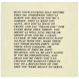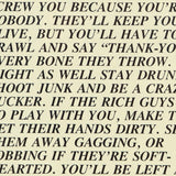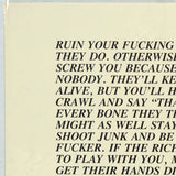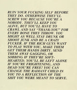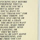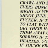 This vanilla colored Inflammatory Essay drips with dark satire and cynicism. Unveiling a bleak view of humanity, it calls for deliberate self-ruin over inevitable ruin at the hands of others ("rich guys"). Complete decimation, including escapism through drugs, or death are presented as the only paths to true freedom. Holzer explores one of her favorite muses, power structures, with the black-heart of a noir novel in this Inflammatory Essay.