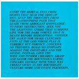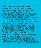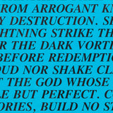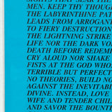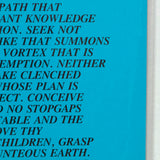 This turquoise-tinted Inflammatory Essay reads like an excerpt from a fiery preacher's fanatical sermon. It warns to believe unquestioningly in a divine, higher power (presumably God), while accepting the hand one is dealt in life. The price for questioning the divine or reaching beyond what has been provided is eternal hell in the afterlife (perdition). Convincingly mimicking fire and brimstone preachers, Holzer exposes the aggressive fear tactics religious figures employ in achieving congregational compliance.