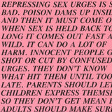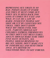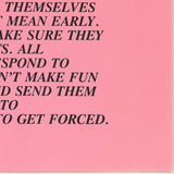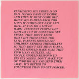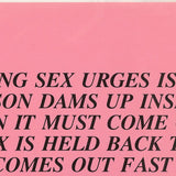 The text for this saturated pink Inflammatory Essay satirically explains the harms of oppressing sexual urges in society. Though created decades ago, Holzer's texts remain timeless and laced with truth...or irony?