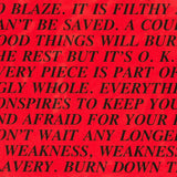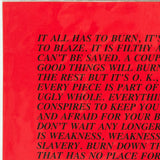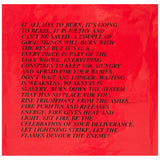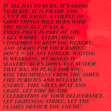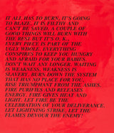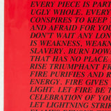 The text for this fiery red Inflammatory Essay drips with both satire and terror. Resounding with anarchistic dogma, it cries out for the burning destruction of a morally corrupt society - which can only be purged through flames. Though created decades ago, Holzer's texts remain timeless and urgent - and perhaps more relevant and chilling than ever given today's political environment.