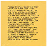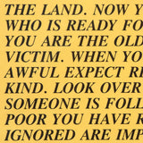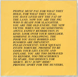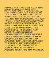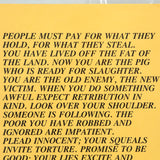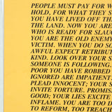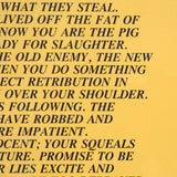 This dusty marigold-tinged Inflammatory Essay proclaims its revolutionary sentiments. The rich, depraved ruling class is denounced for their greed and selfishness. Echoing both Robin Hood and the French Revolution, the elite are in the unforgiving cross-hairs of this angry author. The thirst for payback is palpable, and mercy is non-existent. Like many of Holzer's works, themes of class revolution, history, and power structures are woven throughout the narrative.