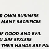 Typically most of Holzer's text-based prints were neither editioned nor signed, as they were more in spirit with "Street Art" than fine art prints.