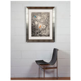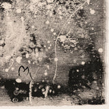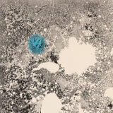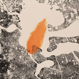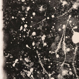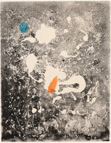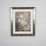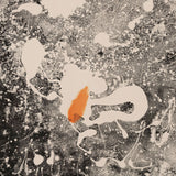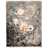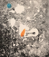 Set against a background of black and varying shades of grey "The Red Spot" is classic Miró. Splotches of white seem to have hurled themselves against the canvas, losing themselves to smaller splatters, sprays, and splotches. A floating orb (one of Miró's signatures) of vibrant turquoise and a blurred comet-like streak of orange punctuate the greyscale galaxy.