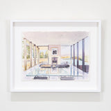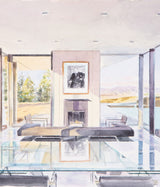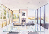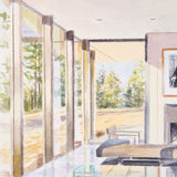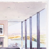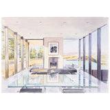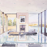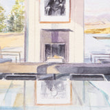 Tod’s mastery of detail and composition is on full display in this intimate and intricate watercolor. Completed in 2022, “Bar Nunn, Wyoming” features a stylish contemporary interior with vast panoramic windows revealing the surrounding landscape. The fireplace mantle in the center divides and contrasts the warmth of the forest from the cool mountainous terrain. While this is a fantasy interior, the space’s artwork is what initially inspired Tod.