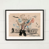 The "Bunny Man", is a paradigm from his oeuvre, with his signature character who seems both defiant and vulnerable. The figure is central in a seemingly chaotic or even violent setting. Is that a government building behind him with a fighter plane in the sky.