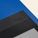 This example, in black, elephant gray, ghost white, charcoal and a bright blue that would make Yves Klein jealous.