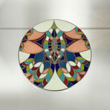 Each of these unique place-settings includes a hand-painted plate depicting a brightly-colored and elaborately styled pattern (often in forms that recall female sexual organs).