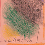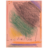 Atypical is the emphatic "Lechaim!" featured at the bottom of the page, bringing the bright and voluminous colors into a cheerful exclamation. (Lechaim is a Hebrew word that translates as "to life" and is used both in prayer and as an equivalent to "cheers")