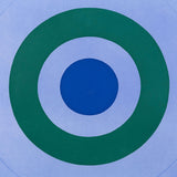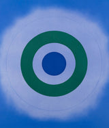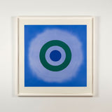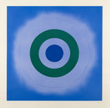 Noland's nuance is apparent in this piece, with the vibrant sky blue background presenting a gentle yet striking contrast to the cobalt center and subsequent bands. The largest ring, a diffused powder blue, is anchored by a confident hunter green, creating a mesmerizing illusion of suspension.
