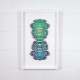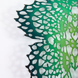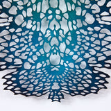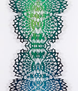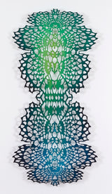 Like the best of Lizz Aston's work she begins by embracing an anonymous textile pattern, such as a hand-made lace doily, and then manipulates it digitally before creating a new contemporary descendant. These transformed and augmented patterns are then hand-cut on fine Japanese Kozo paper (aka mulberry paper) which are then painted, stained or dyed.