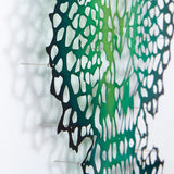 Aston masterfully creates a fluid color scale between two similar, but not identically-shaped forms connected at the middle - creating an hour-glass silhouette. Luminous, glowing shades of jade, lime, azure and teal ombré outward from the centre of their respective shapes, flowing through the form and into each other.