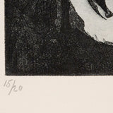 This work is a striking precursor to Nevelson’s iconic work in sculpture. The fragmented figure, comprised of elongated geometric shapes, is an early example of Nevelson’s inclination towards Cubism. As with most of her etchings from this period, this work is realized in heavy black ink, her signature monochromatic palette that evokes a mysterious intensity.