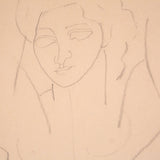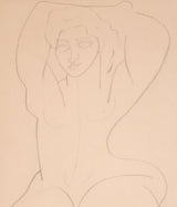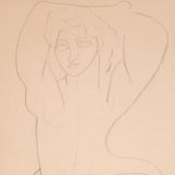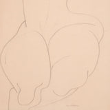 This unique and elegant line drawing reveals a distinct expression of modernism. The influence of both Matisse and Modigliani is evident. The reclining nude figure's lines are bold and stylized, almost sculptural.