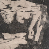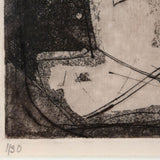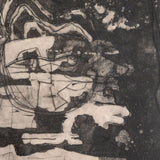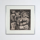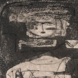To us, this work recalls Jean Dubuffet, with its intricately lined, abstract characters. As with most of her etchings from this period, this work is executed in her signature dark palette and mysterious intensity.