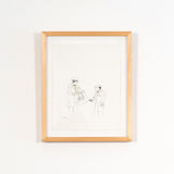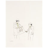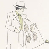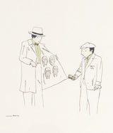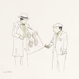 In this untitled work (aka “Street Seller”) we find two men engaged in an ambiguous exchange. The man on the right, dressed in a fedora and trenchcoat, unveils the lining of his jacket to reveal four small gnome-like figures for sale (each with varying expressions). His counterpart extends his arm with a hand full of cash, ready to purchase the bizarre contraband.