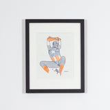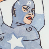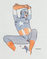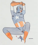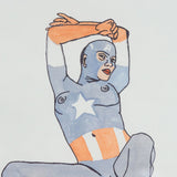In this untitled work (aka “Superhero”) we find a woman sprawled across the center of the page dressed as Captain America (at a fetish party). References to this particular comic book character reoccur throughout Dzama’s oeuvre. The woman is laying on her back, legs spread, with her hands gently tucked behind her head. Despite her dormant (and slightly erotic) position, she gazes back at the viewer with a blatant intensity.