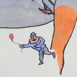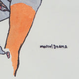 Perhaps the most puzzling aspect of this work is the tiny gnome emerging between her legs, who appears to be exiting after the miniature clown running ahead. Could Dzama be implying that the woman’s body is a circus? What does this mean in the context of her Captain America suit? Like the best of Dzama's work, the viewer is drawn in with obscure clues and asked to assemble a narrative...or just enjoy his wacky imagination.