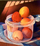 "Peaches in a Plastic Pot" is a striking example of Pratt's signature aesthetic, this time realized through woodcut printing alongside Japanese master printmaker Masato Arikushi of Vancouver. Their collaboration was idyllic, understanding each other's creative intentions from the get-go with little intervention. The two worked together over the span of nine years to complete the series entitled Transformations (1993–2002), which includes this work.