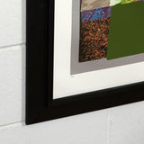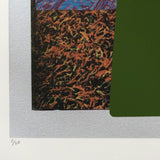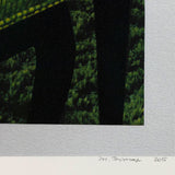Unique mixed media print including screenprint, monoprint, silica flocking, wood veneer and digital printing in colors, on museum board, with full margins.