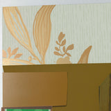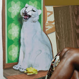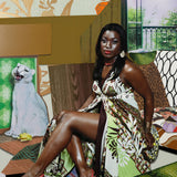 The interior elements seem to hint at domesticated nature: leopard print pillows, crocodile upholstered chairs, a white cat statue, wall paper with floral motifs, and an open window with sunlight and greenery beyond it. Juxtaposing these are elements of pure domesticity: carpets, couches, and wall paper without obvious signs of nature. Thomas' work contains layers of meaning within her vivid and luminous works.
