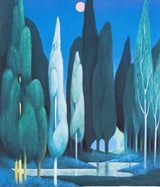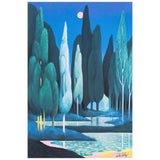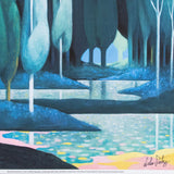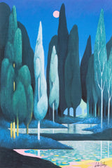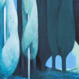 This evocative print shows Party's 2021 painting "Landscape" which was included in "L'Heure Mauve". Depicting a grove of soaring Cypress trees, the dream-like work recalls Magritte's landscapes. It is a prime example of Party's exploration of pastels, offering a luxe and velvety finish to this moonlit vision.