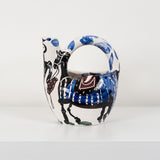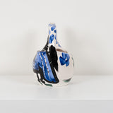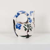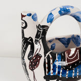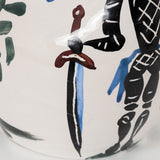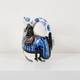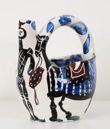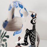 This pitcher emulates and depicts a horse and Picador, both in shape and imagery. The jug's shape is round on the sides with a tall spout on the front, it's body shaped like the horse it represents. On the front of the spout, like a figure-head on a ship, stands the Picador, leading his animal to the ring. A tree and blue petal-like shapes adorn the other side of the vessel, adding to the scene being depicted. Picasso enjoyed the Picador as an image, and depicted it throughout his oeuvre.