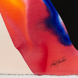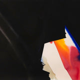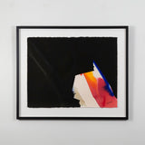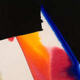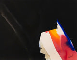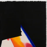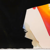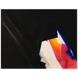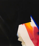 This untitled work is a striking deviation from Jenkin's distinct aesthetic. A heavy wash of midnight black sweeps across the surface of the work, revealing a glimpse of Jenkin's signature diaphorous forms in the bottom right corner. Shades of fuschia, blood orange, tangerine, and cobalt blue shine through in colorful veils that coexist and interact together, creating a subtle abstraction full of life and movement.