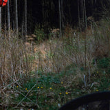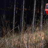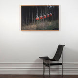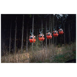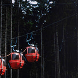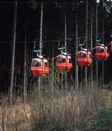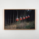 In this image, Doig skillfully frames a group of illuminated gondola lifts against a backdrop of dense, dark woodland. Immersed in a dry summer landscape, Doig captures the ski equipment in off-season, hovering in place as if time has come to a standstill. Seasonal contrast appears to be an important and recurring theme in this series, as evident here.