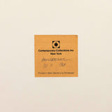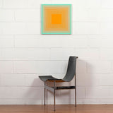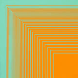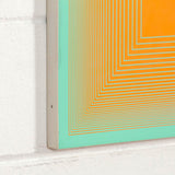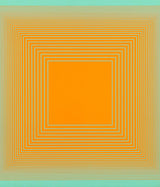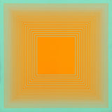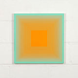 This vibrant screen print is characteristic of the artist’s practice, utilizing citrus colors and blues in concentric squares to draw in and obfuscate the gaze.Â