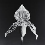 This black and white photograph features a spotted orchid in full bloom, with a stem trailing out of the bottom of the frame. The orchid's upper appendage is striped with elegant wispy lines that follow and emphasize it's tapered, spade-like shape. The flower stands unwavering in the frame, proudly on display.
