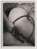In this tightly framed image, there is also an ambiguity of what the viewer is seeing. Are we looking at one body or two? Is the arm holding the whip from the same body with the exposed bottom? In later S&M related images Mapplethorpe's lens maintains a consistent distance from the subject. Here the photographer is so close to the body, he is almost a part of the activity.