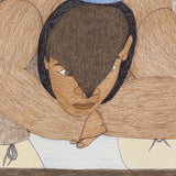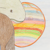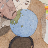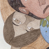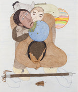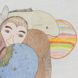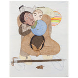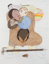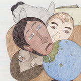 This enigmatic, untitled drawing is an impressive example of Ashoona's style and approach. A single large figure supports the composition, their body hunched over as they bear the weight of a globe (or the whole world) in addition to three ethnically diverse faces that rest on their back. Animals, such as a fish and wolf-like creature fill the middle ground, while a whimsical, rainbow-striped sphere (perhaps an otherworldly planet) peers out from behind.