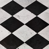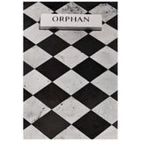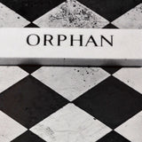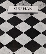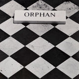"Orphan" is a poignant example of the artist's inquiry into death, loss, and departure. The photograph features a close crop of a black and white checkered tombstone with an inscription plaque that reads, 'Orphan.' Â