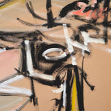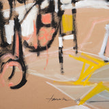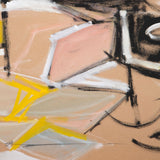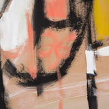 In this elegant untitled work, a neutral board hosts bold, frenetic strokes that fill the picture plane, alternating between linear slashes and smooth contours. Tanabe expertly balances shades of canary yellow, ivory, and black with softer pastels such as sage and ash rose in this dynamic composition.