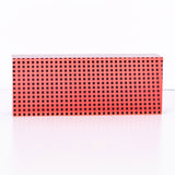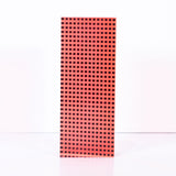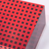 “LACMA Brick Red” features a vibrant red grid that is illuminated and suspended against a solid black background.