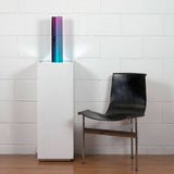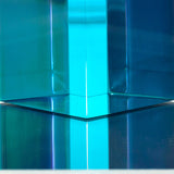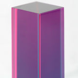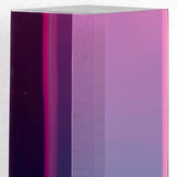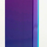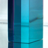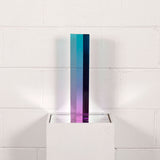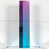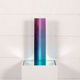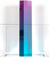 A deep grape candy color starts this sleek and striking sculpture. It gradually transforms into a curious ombre that shifts from purple, to royal blue to a soft teal.