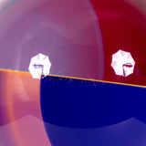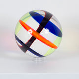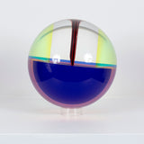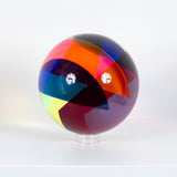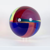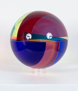 "Harmony Orb" rests on a custom clear acrylic stand, revealing colors and densities that vary based on its position or the viewer's angle. Thin semi-spherical slices fill either end of the work, featuring daring shades of grape, Yves Klein blue, and merlot, which are contrasted by electric accents of blood orange, electric lime, turquoise, and neon pink.